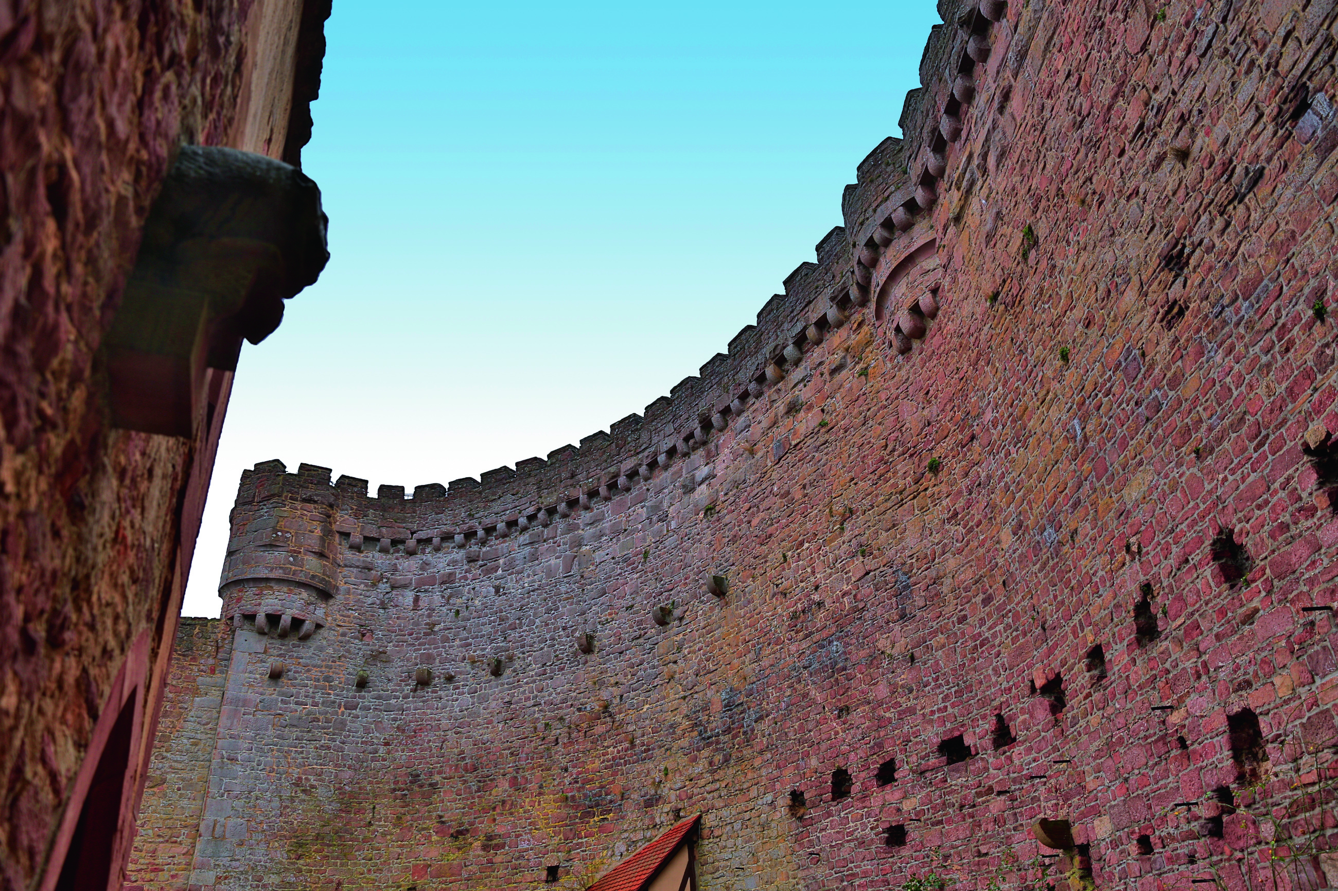 Die Schildmauer ist mit kleinen Türmen, sogenannten Tourellen, ausgestattet.